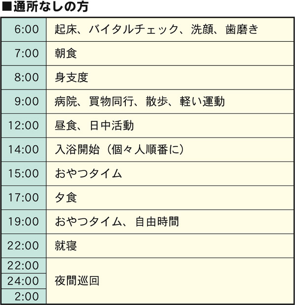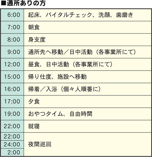 朝は入所者の皆さんの健康チェックから始まり、洗面、歯磨き、朝食を済ませたあと、日中は「通所ありの方」と「通所なしの方」によってスケジュールが異なります。